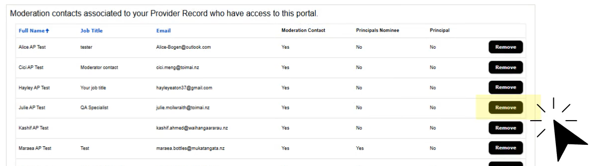 On the Dashboard you will be able to see any other Moderation contacts that are registered for your provider, if you notice that any of these contacts have left your organisation or their role has changed you are able to remove these.