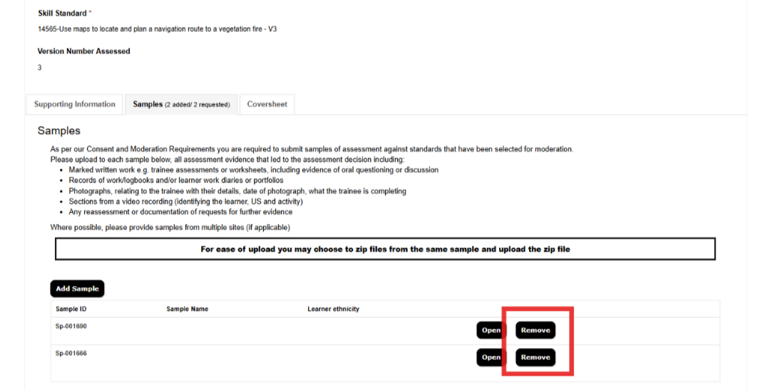 If you inadvertently add a sample that was not required, you are able to remove this from the Skill Standard Samples page. Just select the sample and select the Remove button.