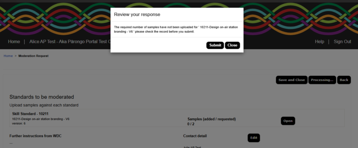 Review the message and close it to return to the request to complete the missing samples and then you can try and submit again.