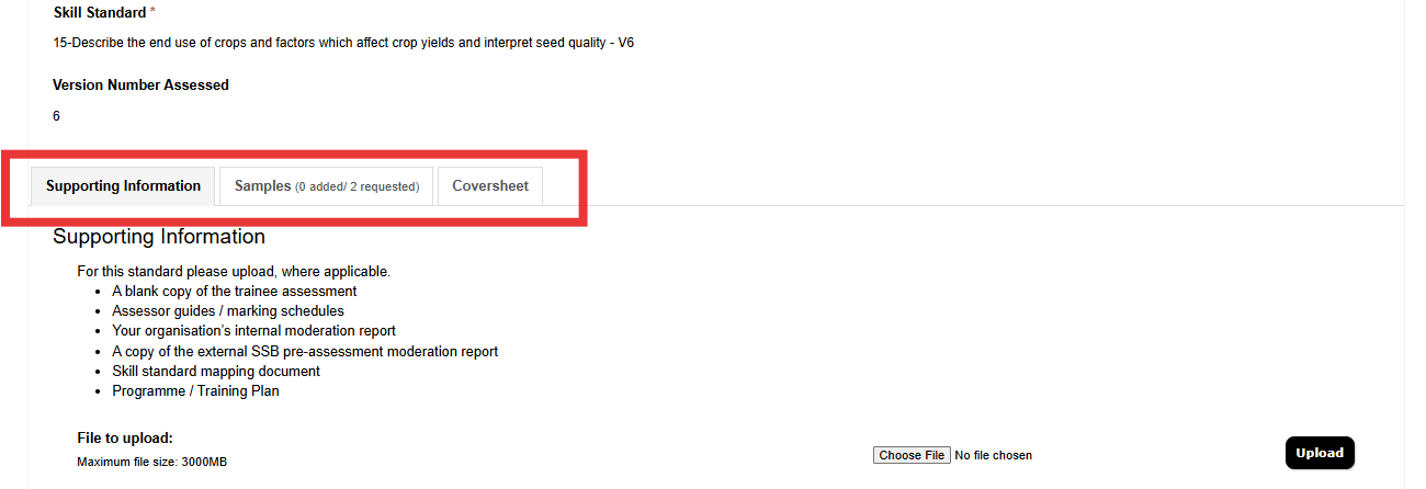 To avoid uploading the same sample multiple times for standards where an integrated assessment was done, you can select the ‘Integrated’ option on the sample record. A selection box will appear with a list of the skill standards available on this moderation request. Select the other applicable skill standards the assessment was for and proceed with uploading the relevant files. The system will recognise the sample across all selected skill standards.