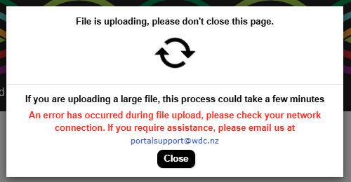 You can then close the message and try again, if the connection has resumed you should not have any further issues, however if the issue persists, please email portalsupport@wdc.nz with the information above.
